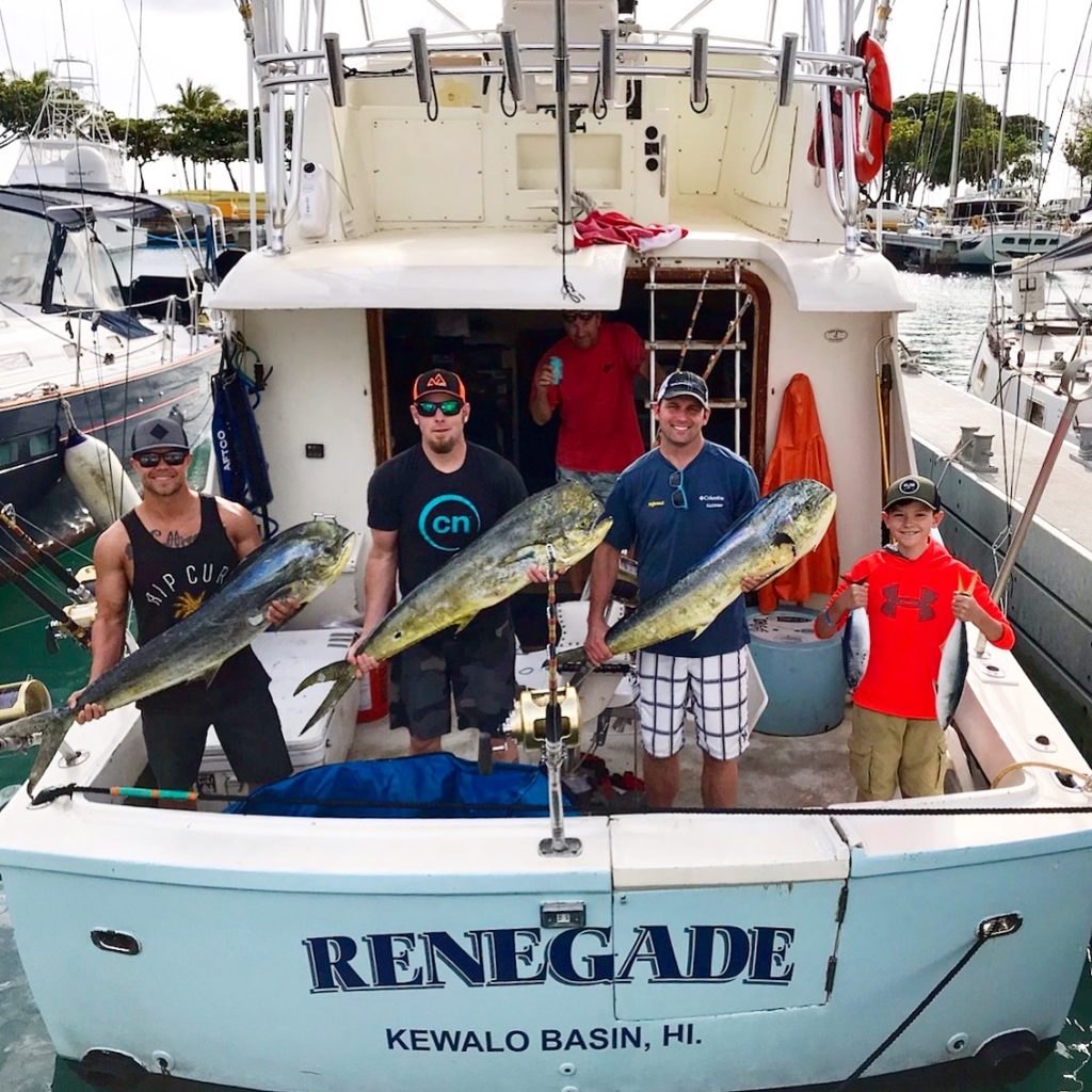 Jump aboard the Renegade, our 38′ Hatteras Sportfish, which welcomes groups up to 6 anglers. Our experienced fishing captains and crew work safely to provide a good time out on the water, while utilizing the ocean’s currents, seabirds and deep water ledges to hunt for Oahu’s pelagic fish. We offer a variety of Oahu sportfishing charters that will provide many opportunities to reel in big game fish. We can also do shorter fishing charters for families with children or anyone looking that’s limited on time.